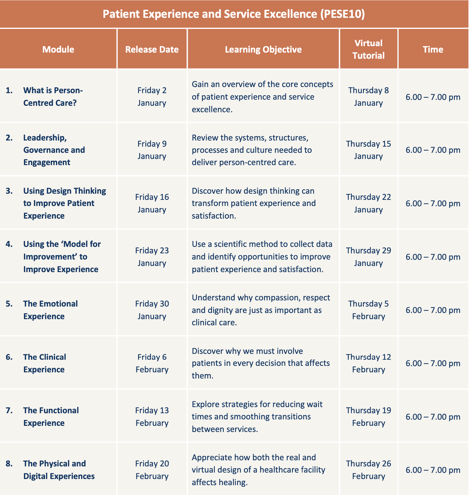 This course will benefit all healthcare professionals who have an interest in person-centered care – including doctors, nurses, allied healthcare professionals and staff in administrative or managerial roles. It is an ideal course for established patient experience leaders who want to update and expand their knowledge and is also very suitable for staff who are aspiring to, or preparing for, future patient experience or service excellence roles.