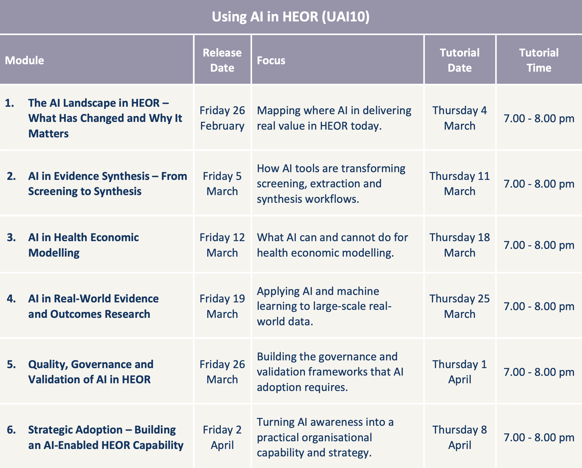 This course provides a structured, critical introduction to AI across the major HEOR disciplines. Over six modules, participants move from the current landscape through evidence synthesis, health economic modelling, real-world evidence and governance — with a consistent emphasis on practical application, validation and the limitations that matter when AI-assisted outputs feed into health technology assessments (HTAs) and reimbursement decisions. The course will be refreshed annually as the technology and regulatory environment evolves, ensuring that participants are learning what is, rather than what was current.
